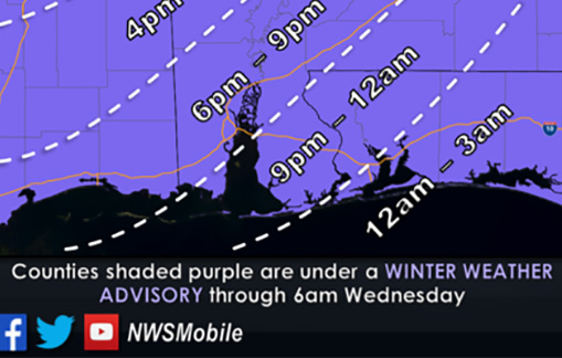 DETAILS…Precipitation initially in the form of a wintry mix of light freezing rain and/or sleet, will soon turn into snow late through mid to late evening. Light ccumulations of freezing rain, less than a tenth of an inch, are expected before the transition to all snow. Total snow accumulations overnight will range from a half inch to an inch, and perhaps as high as up to two inches in heavier bands that form along and east of I-65 over both interior southwest and south central Alabama. Strong north winds will cause dangerous wind chills as values fall into the single digits overnight. Conditions will very slowly improve through noon tomorrow.