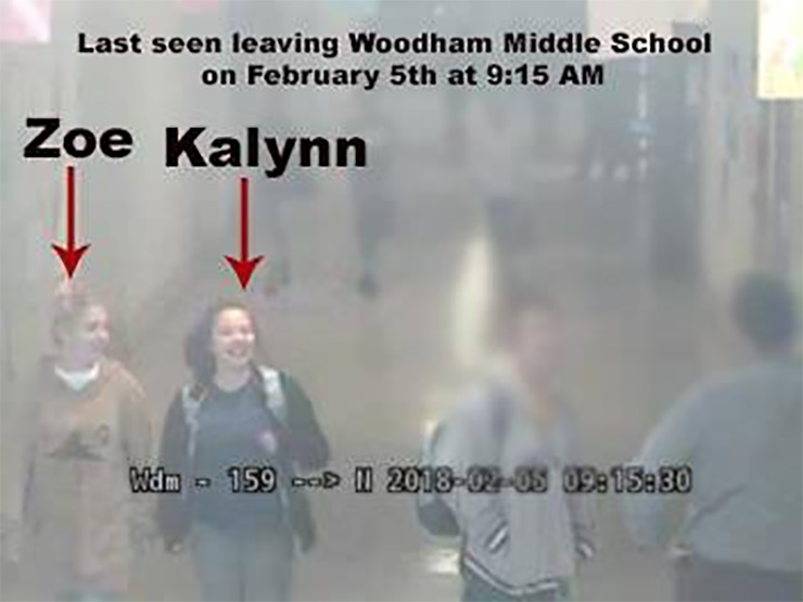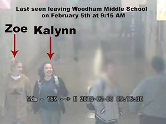 Kaylnn is described as being 5 feet 4 inches tall and 125 pounds, with brown hair and blue eyes. She was seen wearing a black jacket, dark t-shirt, and jeans. earing a black jacket, dark t-shirt, and jeans. Zoe is described as being is 5 foot 6 inches tall and 110 pounds, and has brown eyes and brown hiar. She was late seen wearing a brown hoodie with a white undershirt and jeans.