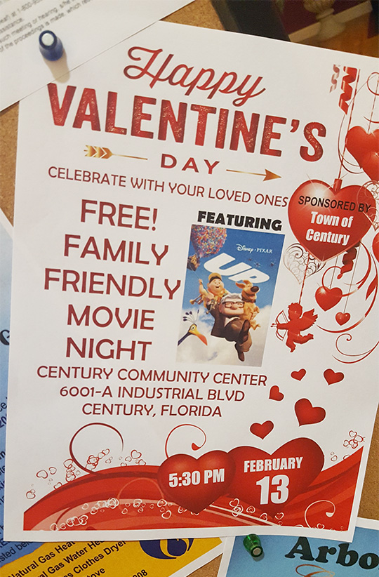 The Town of Century will host a free family friendly movie night tonight for Valentine’s Day. The Disney-Pixar movie “Up” will be shown at 5:30 p.m. at the Century Community Center on West Highway 4 at Industrial Boulevard. Admission is free for all ages. NorthEscambia.com photo, click to enlarge.
