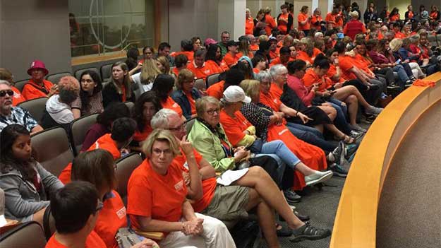 More than 1,000 people, many of them wearing “Rally in Tally” neon orange T-shirts emblazoned with #GunReformNow, traveled by bus to Tallahassee to rally and meet with lawmakers before attending the Rules Committee meeting, where the outspoken and frustrated crowd berated members of the panel.