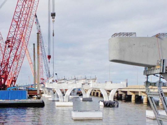 Crews are working to drive concrete piles, place trophy pieces, and install beams for the new Pensacola Bay Bridge.