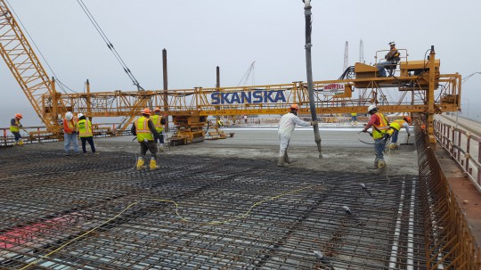 The Pensacola Bay Bridge construction team reached a milestone this week by pouring the first two concrete spans (bottom picture). The bridge spans are cast-in-place atop the beams that connect the trophy pieces. The first spans poured are located on what will become the Gulf Breeze approach for the eventual eastbound (Pensacola to Gulf Breeze) bridge. In total, the bridge design calls for 210 spans, 105 each for the east and westbound bridges.