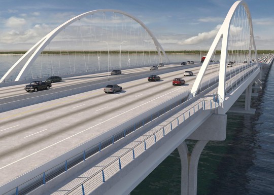 Combined, the two bridges will feature three eastbound and three westbound travel lanes, flanked by 10-foot shoulders. Both bridges will also include 10-foot multi-use paths for pedestrians and bicyclists.