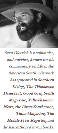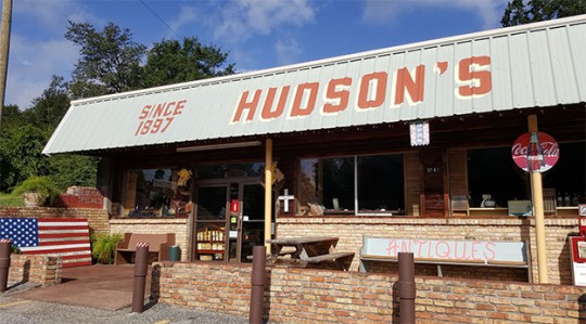 I’m sitting in Hudson’s Grocery, sipping tea from a jelly jar, eating fried catfish and collards. There are buck-heads on the wall. Black-and-white family photos. Mounted large-mouth bass. A few customers in cowboy hats. I have tartar sauce on my shirt.