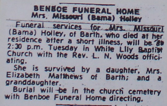 Bama died February 13, 1970, after a brief illness and is buried in Barth in the White Lily Baptist Church Cemetery.