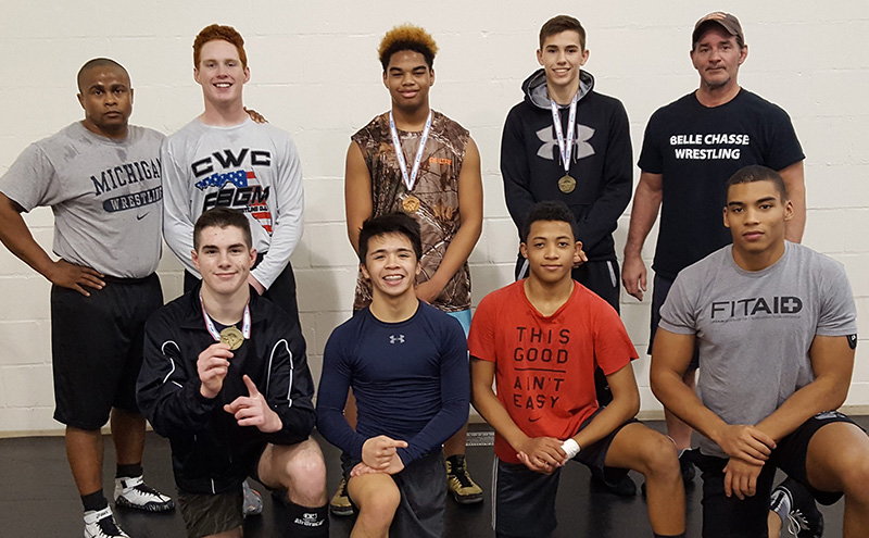 The Tate High School Wrestling Team recently placed fifth overall in the District 1-2A championships and regional qualifier. Individual medalists were (bottom row, L-R) Nate Golmon 152 pound district champion, Jacob Cochran 113 pound district champion, Brandon Biello 120 pound fourth place, Asst. Coach Patrick Brown; (top, L-R) Asst. Coach Dean Williams Jr, Anthony Stafford 182 pound second place, Azaya Purifoy 195 pound third place, Matthew Blalock 132 pound district champion, Head Coach Reggie Allen. Not pictured: Assistant Coach Vaughan Gehman and 160 pound forth place Juan Alvarez Jr. Photo for NorthEscambia.com, click to enlarge.
