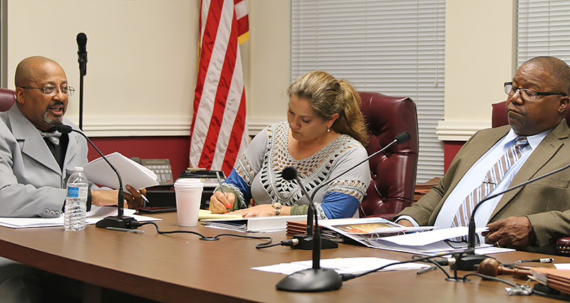 Pictured: (L-R) Century Mayor Henry Hawkins, Interim Town Clerk Kim Godwin and council member Louis Gomez Monday night. NorthEscambia.com photo, click to enlarge.