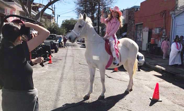 T-Mobile debuted a new commercial titled “Parade” during the Oscars. It begins with seemingly disheartened boy outside his New Orleans home. But things come to life as a parade of people wearing T-Mobile pink approaches, including a shot, albeit very brief, of Parker on horse JoJo.