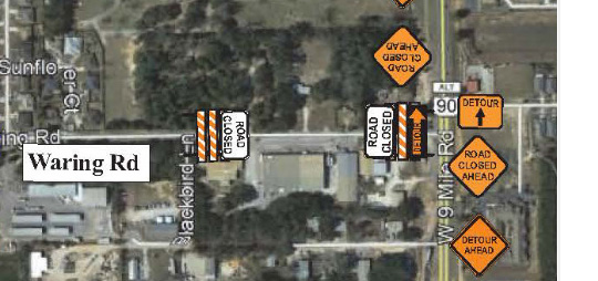 Waring Road between Nine Mile Road and Bush Street will be closed to through traffic. Traffic will be detoured along Pine Forest Road, Bush Street and West Detroit Blvd. The closures/detours are expected to remain in effect for approximately one week. Escambia County officials said efford will be made to expedite construction efforts to reopen the road earlier.