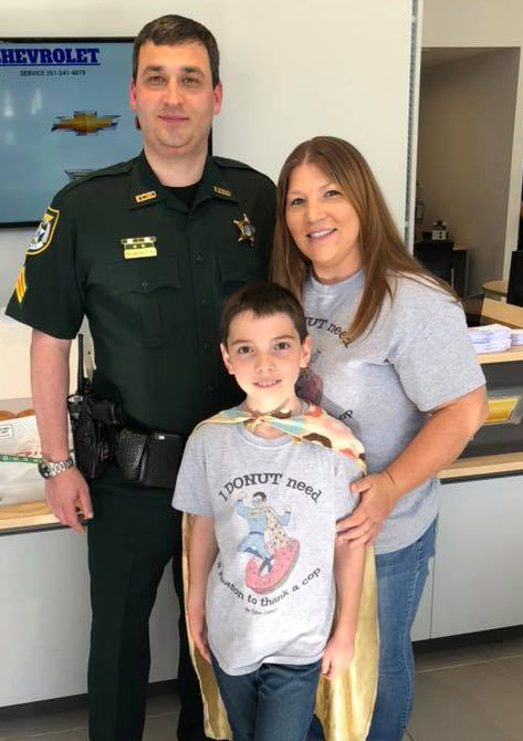 Since buying doughnuts for four Escambia County (FL) deputies at a Bratt convenience in August 2016, Tyler has taken his mission on the road to thank every cop in America with a doughnut. He’s visited departments from Los Angeles to New York.