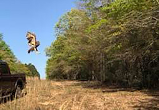 Ben Preston, David Preston, Ross Daughdrill, Lakelynn Parker and Tammy Parker were hunting when Ben Preston went out to retrieve a duck that had fallen into a wooded area. He came upon the owl hanging from the fishing line. They covered the owl with a bag while the fishing line was cut. Ben and Lakelynn wrapped the owl in Ben’s jacket and put him in their boat.