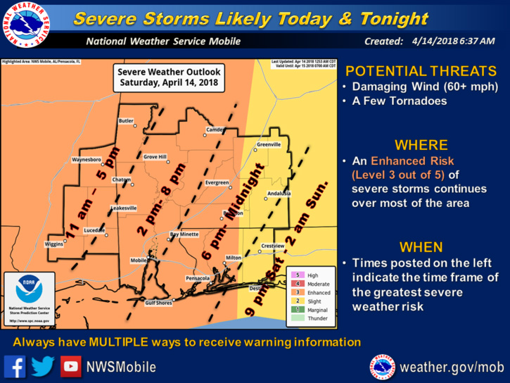 The National Weather Service says there is a an enhanced risk of severe storm across the area. Damaging winds, a few tornadoes and flooding are possible.
