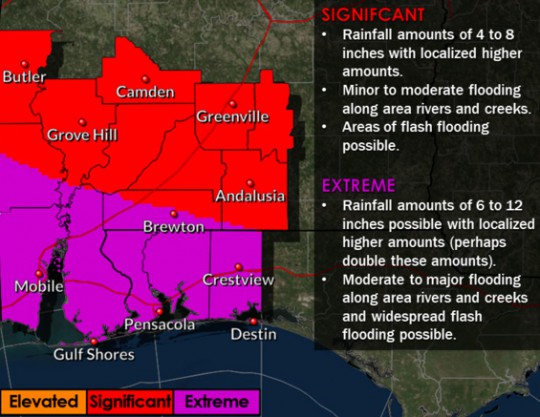 The biggest threat to the North Escambia area is currently forecast to be rain and flooding. The area remains under an extreme flood threat Saturday through Tuesday. Rainfall amounts of 6-12 inches are possible with localized amounts of 12 to 24 inches, according to the National Weather Service. Moderate to major flooding is possible along area rivers and creeks, and widespread flash flooding is possible.v