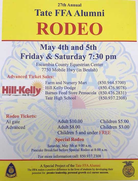 The 27th Annual Tate FFA Alumni Foundation Rodeo will be Friday and Saturday nights at 7:30 at the Escambia County Equestrian Center on Mobile Highway.