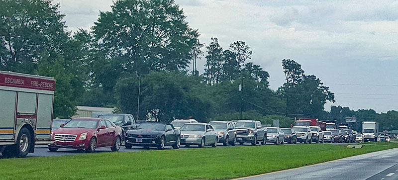Pictured top: Northbound Highway 29 traffic backed up due to a malfunctioning railroad crossing early Tuesday afternoon. Photo for NorthEscambia.com, click to enlarge.