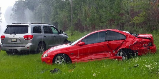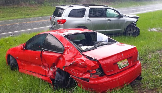 This was just a freak accident luckily no-one was injured. No-one was speeding or doing anything wrong. The car hit some holding water on the road and hydroplained out of control. Wet roads are dangerous.