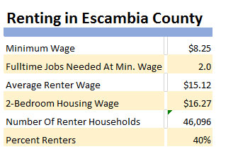 In order the afford a two bedroom apartment in Escambia County, the report says a worker needs to earn $16.27 per hour. There are 46,096 renter households — about 40 percent of all households — in Escambia County. Those household earn an estimate average wage of $15.12.