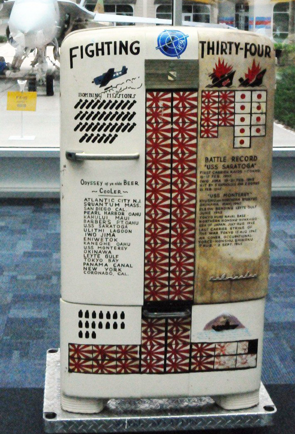 An icebox was dedicated to the museum that the VF-34 squadron had with them in their ready room during World War II. It is adorned with a roster of squadron personnel and the squadron’s combat record.