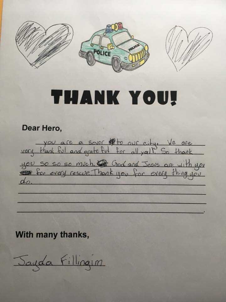 “You area a savor to our city. We are very thankful and grateful for all yall. So thank you so so much. God and Jesus are with you for ever rescue. Thank you for every thing you do,” Jayda Fillingim wrote.