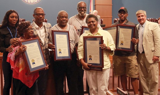 The Escambia County Commission recently recognized the 1955 Pensacola Jaycees Baseball Team for their peaceful and heroic contribution to the civil rights movement. The group of 12-year-old boys and their families risked social, physical and economic repercussions for playing the first game of integrated Little League baseball in the south against the all-white team the Orlando Kiwanis. Shortstop Admiral LeRoy, second baseman Rev. Freddie Augustine and family representatives of Clyde Charley, Richard Morris and Phillip Stewart attended the commission meeting.