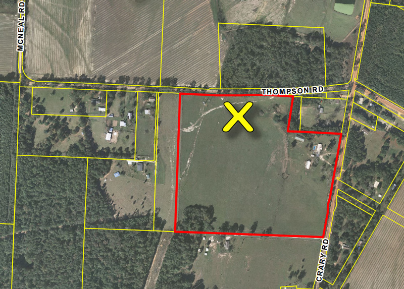 Pictured: The yellow “X” marks the approximate spot of a potential new 300-foot high communications tower. NorthEscambia.com graphic.