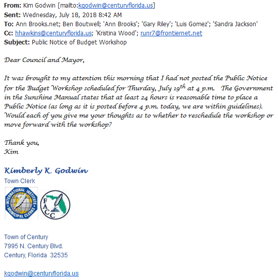 Hey, I actually read the email letter in the article it would appear that a Kimberly K Godwin, Town Clerk is the one who “…had not posted the Public Notice for the Budget Workshop…”.