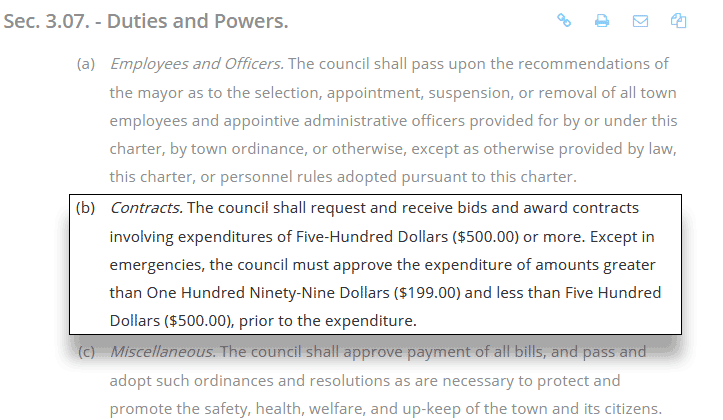 “The council shall request and receive bids and award contracts involving expenditures of Five-Hundred Dollars ($500.00) or more. Except in emergencies, the council must approve the expenditure of amounts greater than One Hundred Ninety-Nine Dollars($199.00) and less than Five Hundred Dollars ($500.00), prior to the expenditure.”
