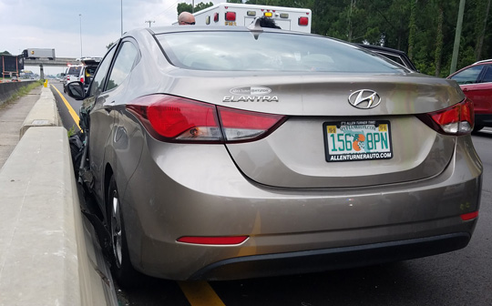 At least one person suffered injuries when a car collided with a concrete barrier on Highway 29 at I-10 Monday afternoon. The crash is under investigation by the Florida Highway Patrol. NorthEscambia.com photos by Kristi Barbour, click to enlarge.