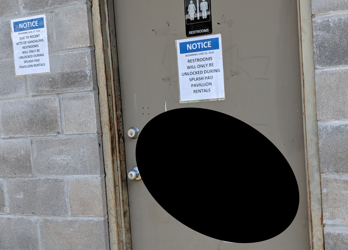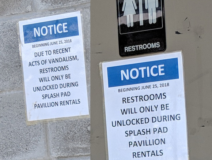 “Due to recent acts of vandalism, restrooms will only be unlocked during splash pad and pavillion (sic) rentals,” a posted notice stated.