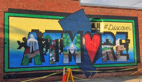 The 12-foot by 30-foot mural was painted on the north side of the Atmore Area Chamber of Commerce on Ridgely Street at North Main Street. It highlights local scenes inside each of the giant letters.