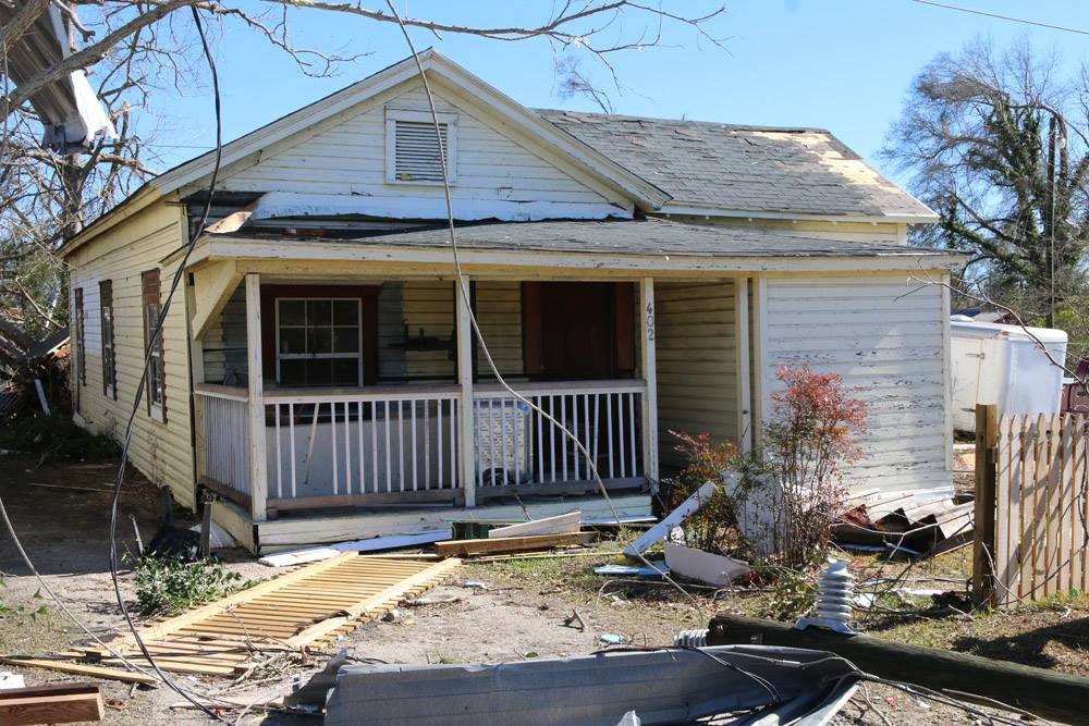 Pictured top and bottom: A tornado damaged house belonging to Felic Fussner on Front Street in Century. The top photo was taken less than 24 hours after the tornado. Pictured middle: Escambia County Neighborhood Enterprise Division Manager Meredith Reeves takes housing assistance applications from unnamed residents at Century Town Hall on March 4, 2016. NorthEscambia.com photos, click to enlarge.