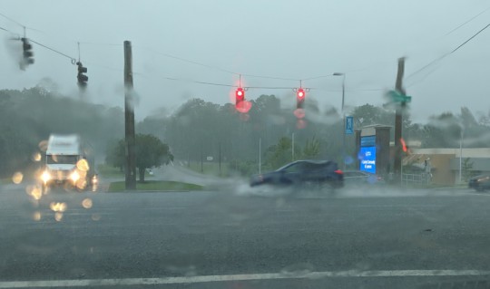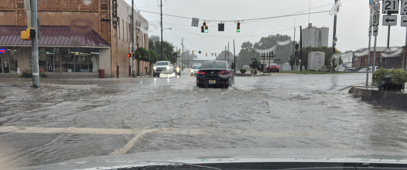 Pictured top: Rain and minor flooding Wednesday morning on Nine Mile Road at Campus Drive. Pictured below: Flash flooding in downtown Atmore Wednesday afternoon. NorthEscambia.com photos, click to enlarge.