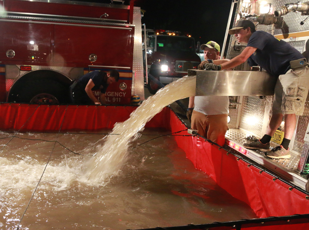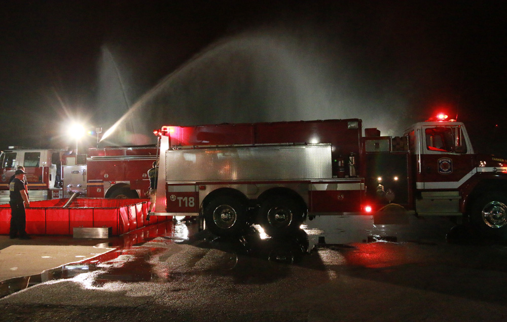 Tanker trucks and a “drop tank” holding thousands of gallons are used to shuttle and supply water to firefighters when there is no or an inadequate water supply from a nearby fire hydrant.