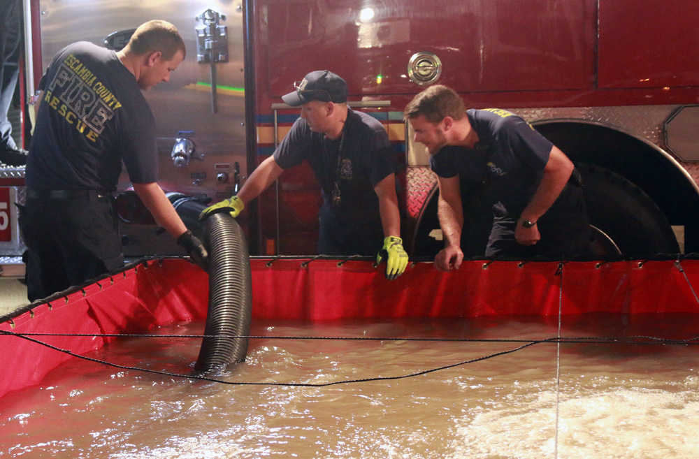 Volunteer firefighters from four North Escambia fire stations practiced moving a lot of water quickly Monday night at the Walnut Hill Station of Escambia Rescue.