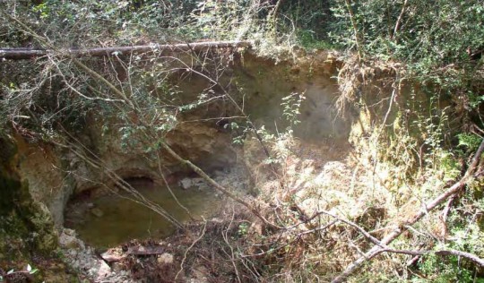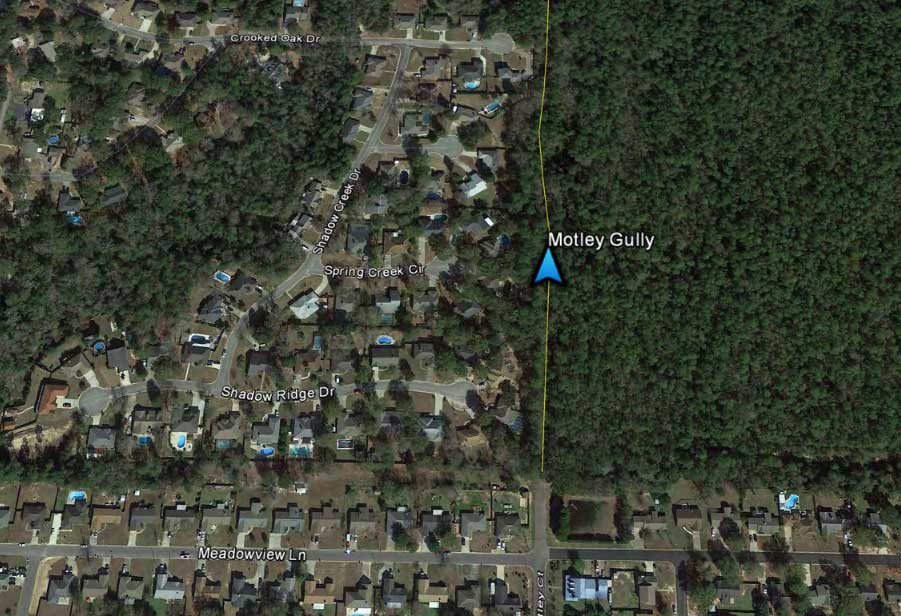 The drainage way is located within a 30-foot right of way starting at the north end of Motley Court and extending about 1,700 feet to Clear Creek. An open ditch has eroded into a meandering gully, ranging from 10 to 40 feet wide, 3-20 feet deep and extending to University of West Florida property.