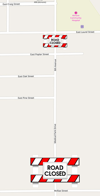 Medical Park Drive in Atmore will be closed from East Laurel Street to McRae Street on Thursday for 8 a.m. until 3 p.m. for utility work, according to the City of Atmore.