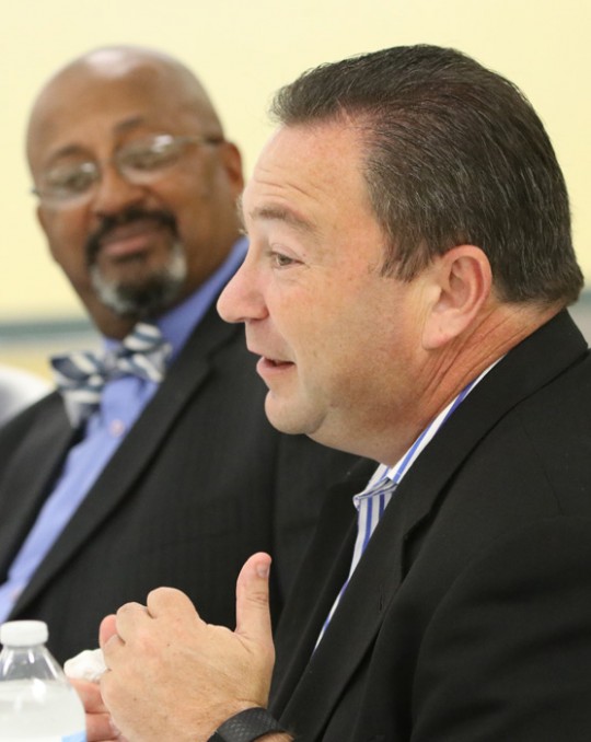 Pictured top: (L-R) Florida Democratic Party chair Terry Rizzio, Century Mayor Henry Hawkins and Florida CFO candidate Jeremy Ring. Pictured inset: Jeremy Ring. Pictured below: U.S. House candidate Jennifer Zimmerman (left) and Florida House District 1 candidate Vikki Garrett listen during Wednesday’s discussion in Century. Pictured bottom: Hawkins listens to Ring. NorthEscambia.com photos. click to enlarge.