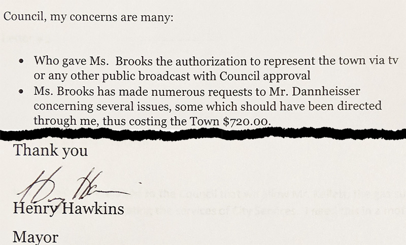 “Who gave Ms. Brooks the authorization to represent the town via TV or any other public broadcast without Council approval,” Hawkins wrote in his letter presented Monday.