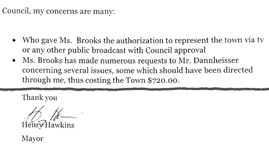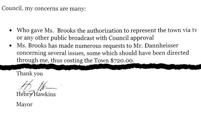 Hawkins requested, via his letter, than the town “hold everyone in check as to what they do for this Town. If the Council has not given Ms. Brooks the authorization to by pass [SIC} me and take matters into her own hands without the knowledge of the Town or our staff then I think that it’s fair that we do no pay any unauthorized charges due, we hold the responsible person(s) responsible and that we do not act on the behalf of the Town without consent from the Town and the knowledge of the Mayor. I need this in a motion (please)”.