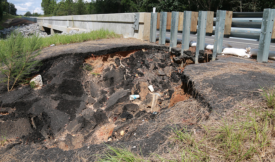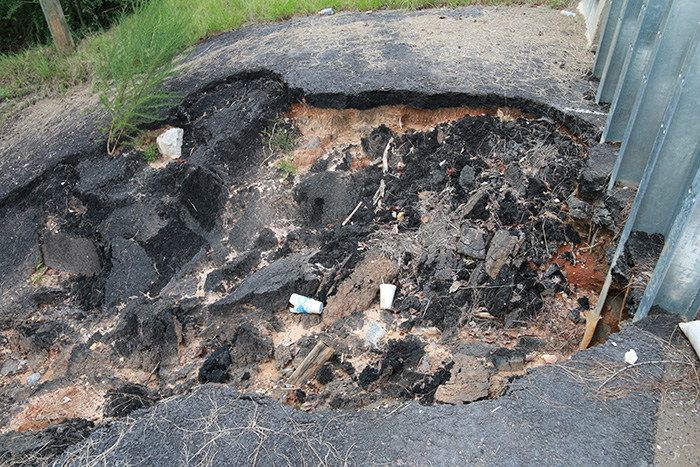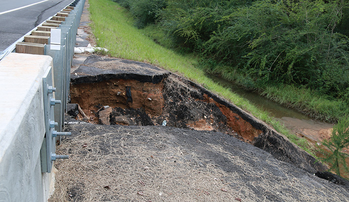 A portion of the asphalt shoulder on Molino Road near Sunshine Hill Road collapsed before Tropical Storm Gordon. It did not cause the roadway to collapse and did not impact the bridge itself.