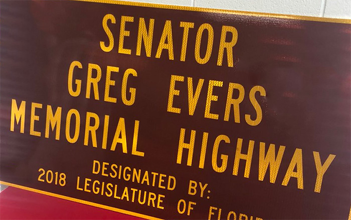 A stretch of road in Santa Rosa and Okaloosa counties was official dedicated Monday as “Senator Greg Evers Memorial Highway.” Evers, 62, died last summer in a single-vehicle accident near his home in Okaloosa County.