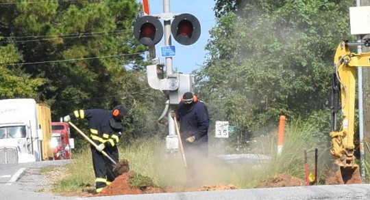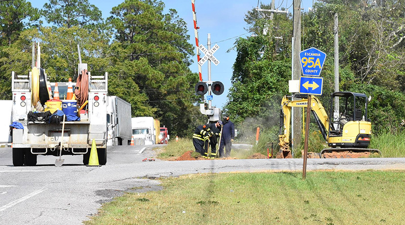 A backhoe reportedly struck a natural gas line near a railroad track just before 2 p.m. A cloud of gas was visibly leaking from the line. The leak was secured by Pensacola Energy about 2:40 p.m. and the roadway reopened.