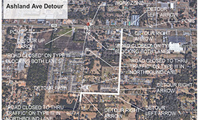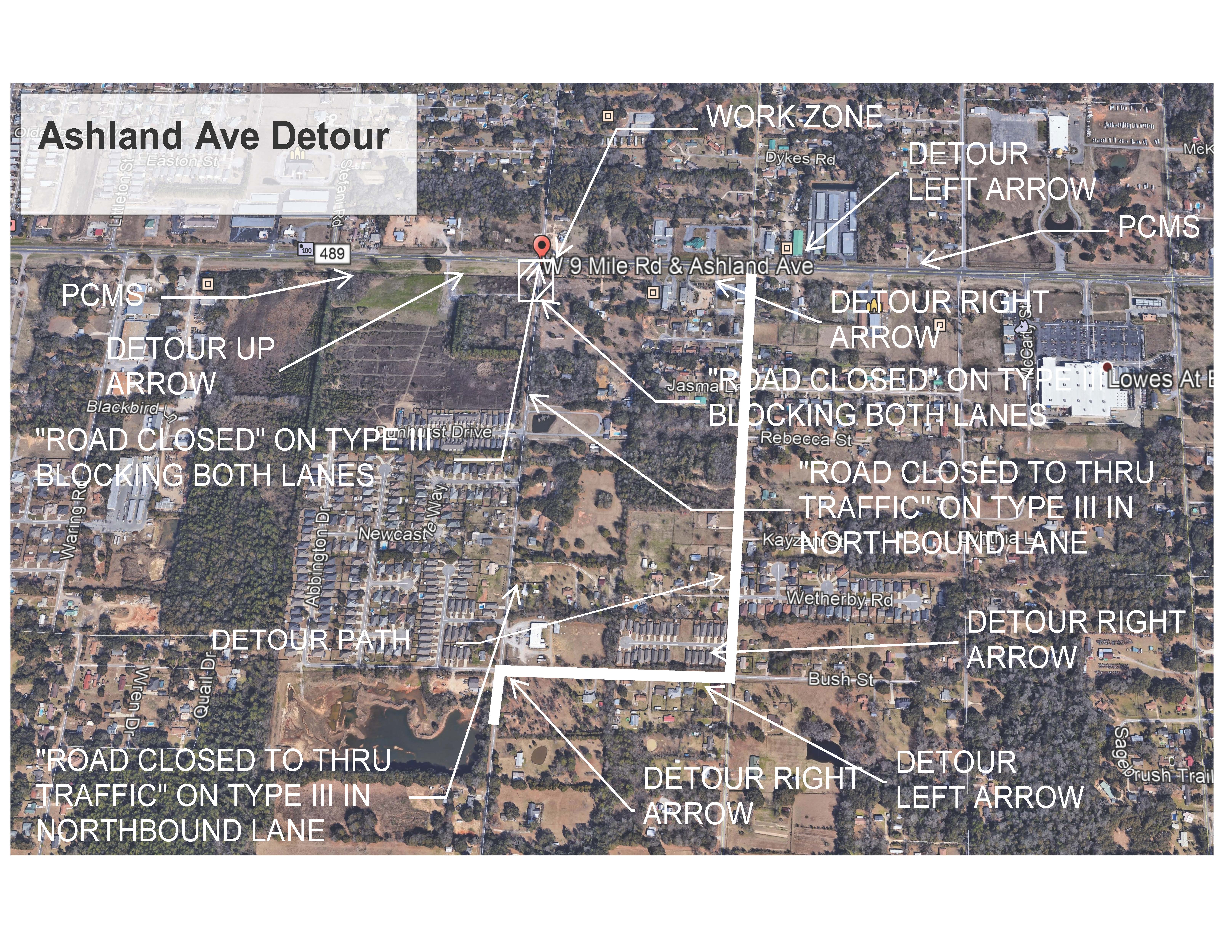 The intersection of Ashland Avenue between Nine Mile Road and Bush Street will experience a closure beginning Tuesday, Oct. 2 at 7 a.m. Traffic heading south will be detoured along Bowman Avenue to Bush Street, then west to Ashland Avenue. Traffic heading north along Ashland Avenue will be detoured east down Bush Street to Bowman Avenue, then north to Nine Mile Road.