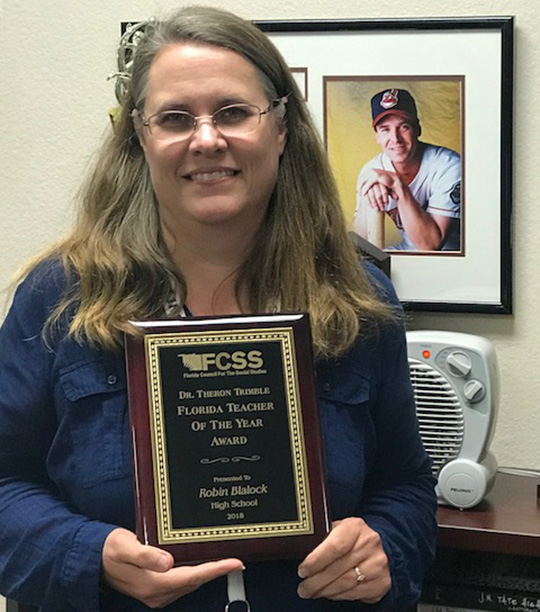 Tate High School teacher Robin Blalock has been name the Florida Council for the Social Studies 2018 Florida Teacher of the Year. Blalock was named one of Escambia County’s Social Studies Teachers of the Year earlier this year. Photo for NorthEscambia.com, click to enlarge.