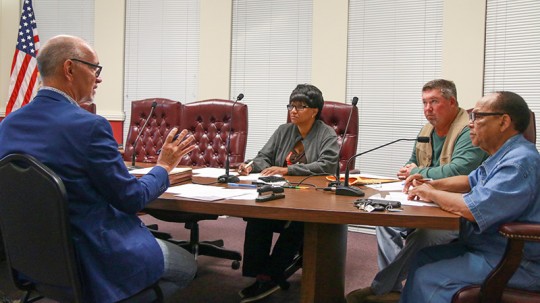 Pictured: Accountant Robert Hudson (left) explains the Century Gas Department financial situation to town council members Sandra McMurray-Jackson, Ben Boutwell and Gary Riley Thursday afternoon. NorthEscambia.com photo, click to enlarge.