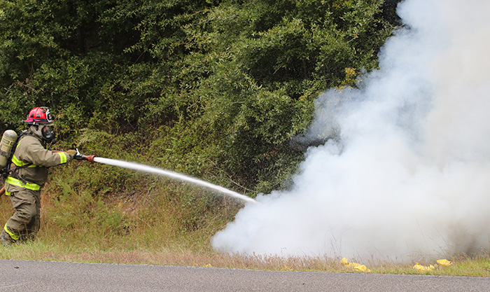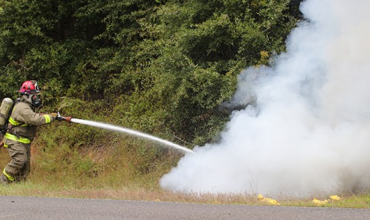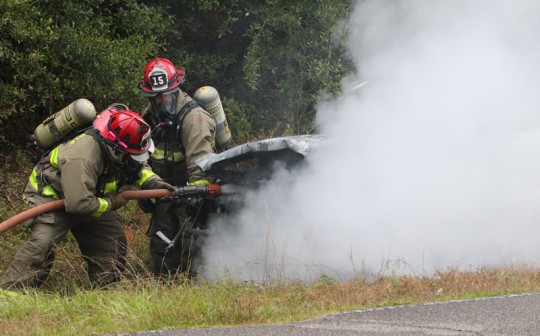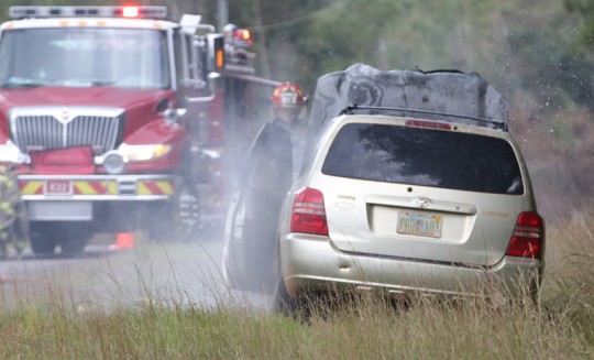 Pictured above and below: A vehicle fire Monday afternoon in Bratt before it is extinguished by firefighters (bottom). NorthEscambia.com photos, click to enlarge.