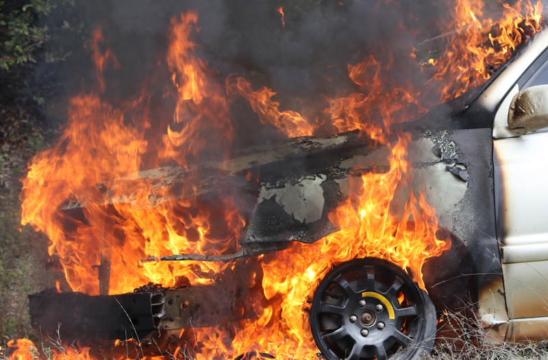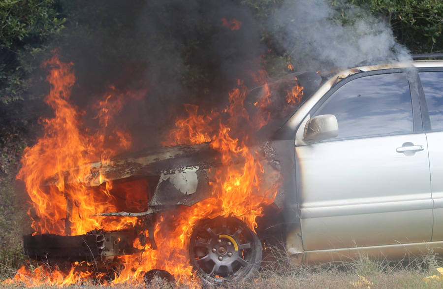 Fire destroyed a vehicle near Bratt Monday afternoon after driver of a Toyota Highlander pulled the vehicle off the roadway along Highway 168 near North Pine Barren Road.