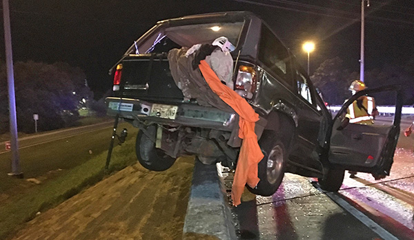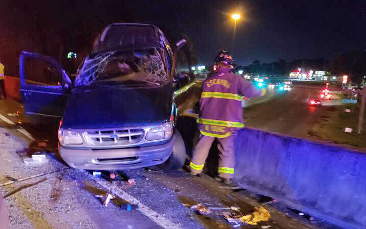 A vehicle was left hanging over Pine Forest Road after a crash on an I-10 bridge Saturday night.