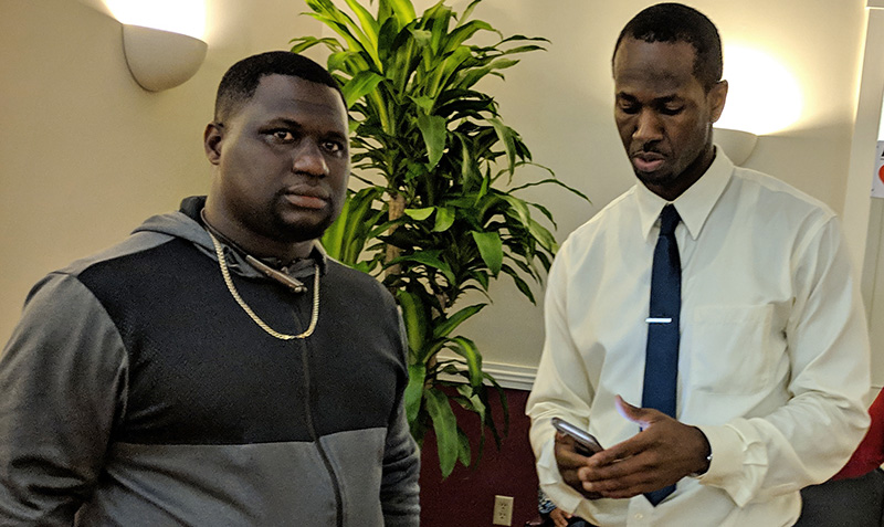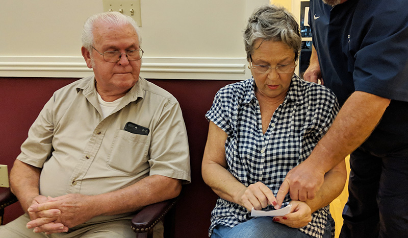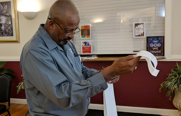 Pictured top: Ben Boutwell and James Smith, Jr. Picture below: Amanuel Dubose and Smith. Pictured below: Former Century Mayor Freddie McCall watches as Mary Bourgeois looks at election returns. Pictured below: Current Century Mayor Henry Hawkins reviews vote totals from the Century precinct before they are posted for public view on the polling room door. Pictured bottom: Boutwell and his wife Cheryl wave at voters Tuesday afternoon outside the Century precinct. NorthEscambia.com photos, click to enlarge.