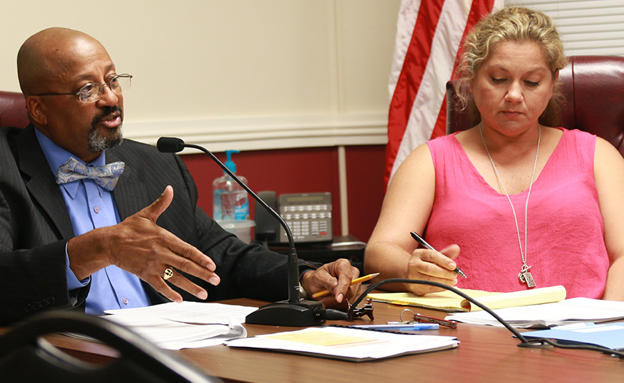 Pictured: Town Clerk Kimberly Godwin takes handwritten notes at the September 3 Century Town Council meeting as Mayor Henry Hawkins speaks. Those notes have now been reported stolen. NorthEscambia.com photo, click to enlarge.